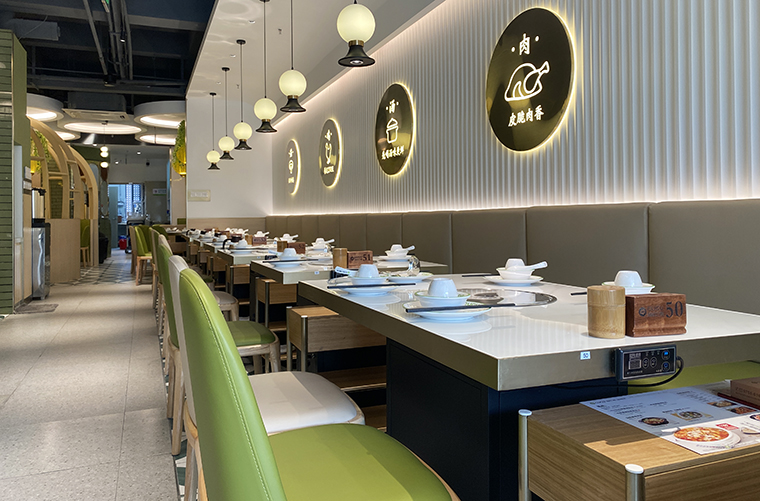 大浪商業中心的后浪新天地作為深圳市“夜間經濟示范點”,旨在向消費者提供更具品質感與趣味性的消費體驗,打造出地方特色,構建成龍華夜生活集聚區,為消費者帶來文旅性街區商業消費新體驗。后浪新天地年輕人眾多,對美食除了美味之外還要有美觀,能滿足打卡,拍攝分享的需要。我們的餐區面積約265平方米,在餐位形式分布方面,我們以4人位為主,2人位10張臺,6人位圓臺5張,10人包間2個。餐位的設置以滿足年輕人小聚為主,兼顧家庭小聚。在有限的面積內實現了用餐舒適性及空間利用最大化的完美統一。