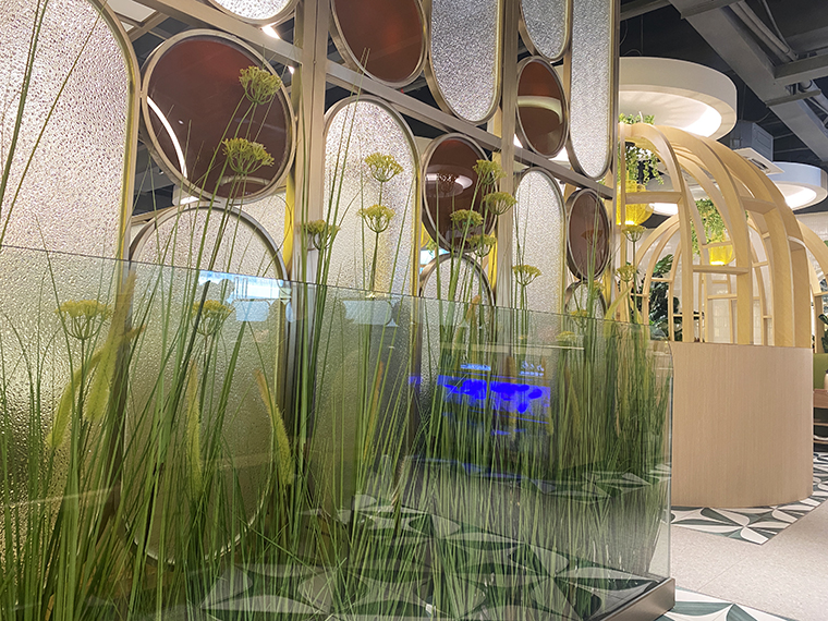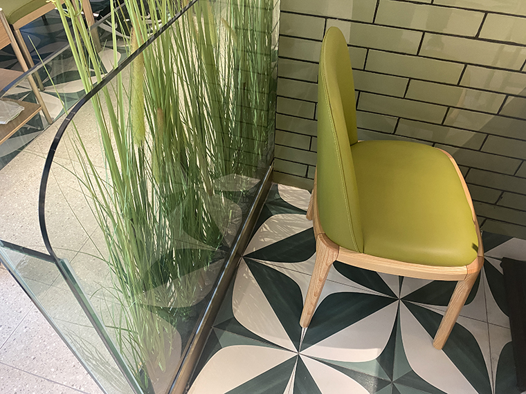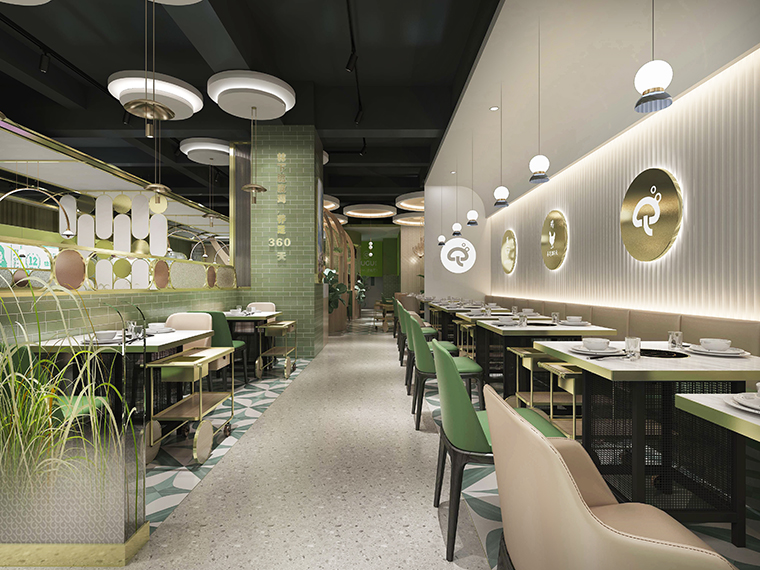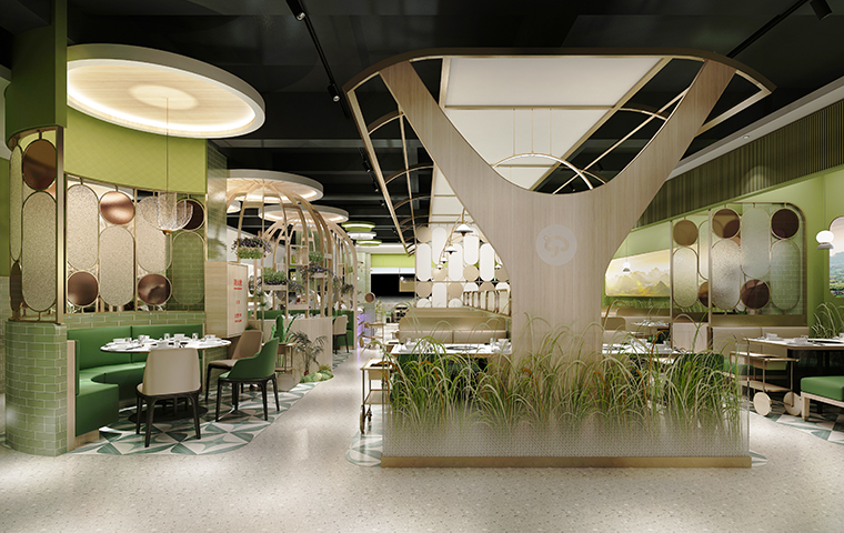 為了營造自然,清新,通透的空間感受,體現咕咕豬肚雞清湯養生特點,品深餐飲裝飾設計團隊使用了淺木色半包鳥籠造型,隔斷中遍種仿真綠植,墻面以淺白色手工磚突出了發光不銹鋼廣告畫面的內容,簡約又具有鮮明的廣告效果,很好地將咕咕豬肚雞的品牌文化、品牌形象及品牌內容在空間中展現出來了。